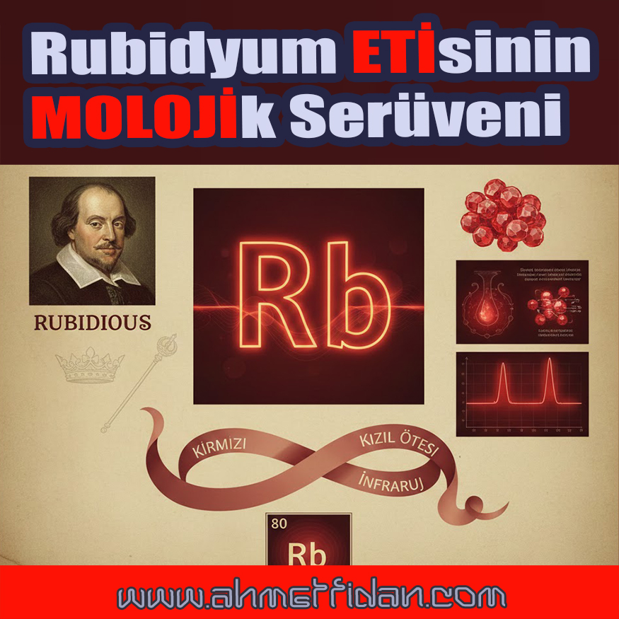 Alkali metallerdendir kendisi ama, sevgili elementimiz 37 atom numarasına sahiptir. Adını da latincede “koyu kırmızı” anlamına gelen “rubidus” tan (ruber /kırmızı +ium) almıştır. İngiliz Fransız bileşiminde (erythrós ερυθρός “kırmızı” Hint Avrupa dil ailesinde ve Sanskritçede rudhira Latince ruber, Germence *raud- > Almanca rot = İngilizce red “kırmızı”, İngilizce ruddy “kızıl”, rust “demir pası”.) Eritre ülkesi de adını yine bu kızıl teriminden alır ve sahili de zaten Kızıl Denizidir.